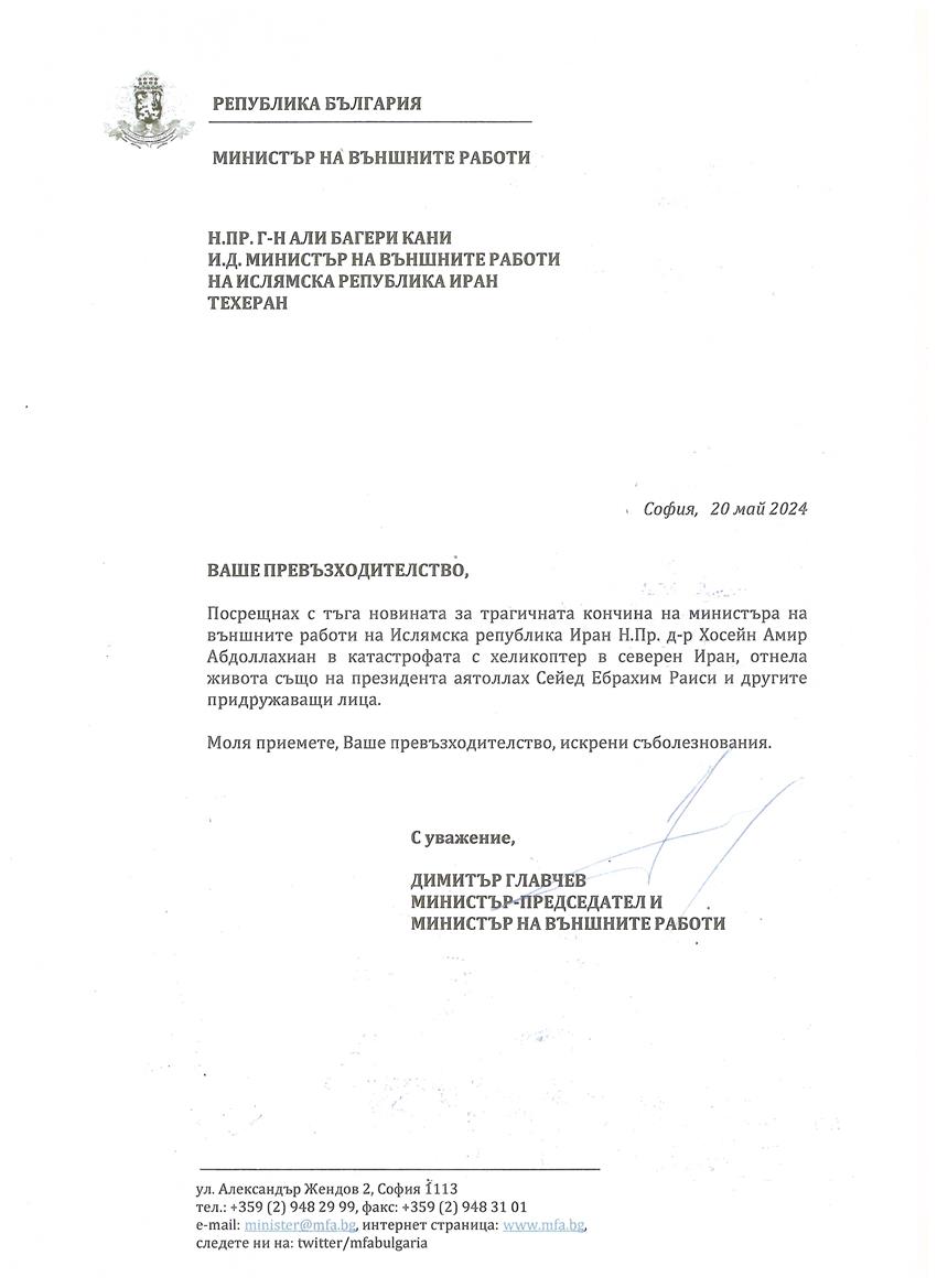 Condolence message of the Prime Minister and Minister of Foreign Affairs of Bulgaria to the Acting Minister of Foreign Affairs of Iran regarding the martyrdom of the President of Iran and official companions.