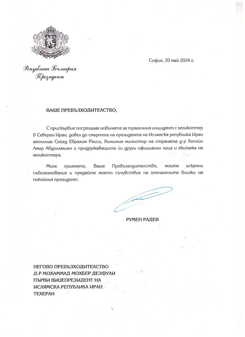 پیام تسلیت رومن رادف، رئیس جمهور بلغارستان به جناب آقای محمد مخبر، سرپرست ریاست جمهوری در خصوص شهادت رئیس جمهور ایران و همراهان