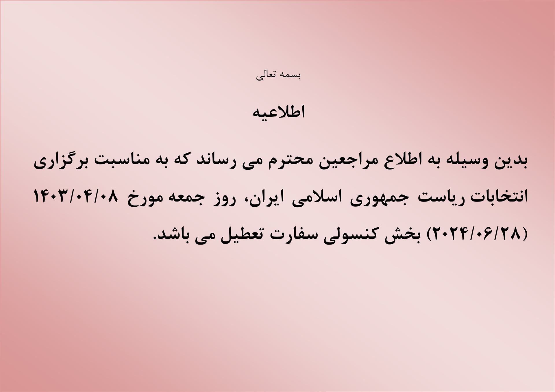 اطلاعیه تعطیلی بخش کنسولی سفارت روز جمعه 08/04/1403